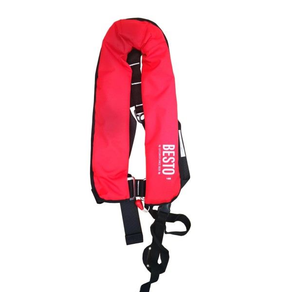 Vestă de salvare Besto 165N pentru adulți. Vesta de salvare, se umflă automat în contact cu apa. De asemenea, se umflă acționată manual pentru siguranță. Poate fi utilizat atât pe apele interioare, cât și pe mare, fiind rezistentă la valuri mari.