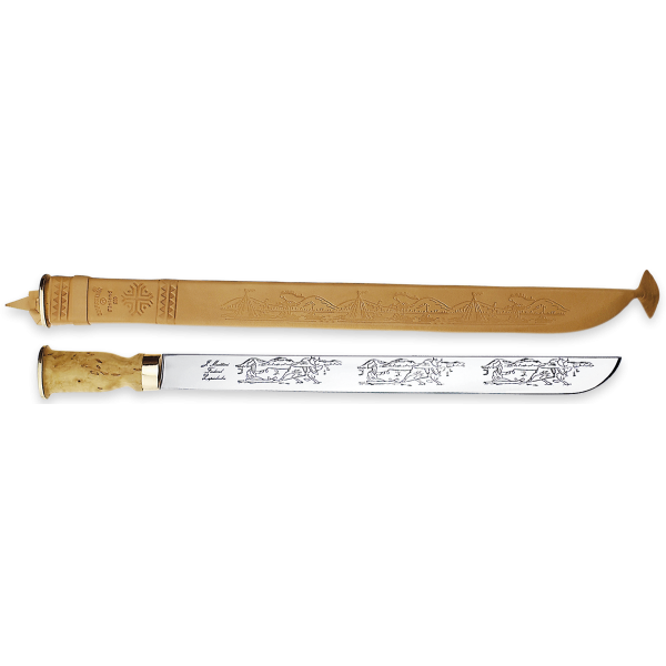 Acest cuțit impresionant are o lungime de aproape jumătate de metru. Lama este decorată cu o temă tradițională de Lappish. Acest cuțit este cu siguranță unul de observat! Teaca de piele prezintă scene tradiționale ale Lappish.
