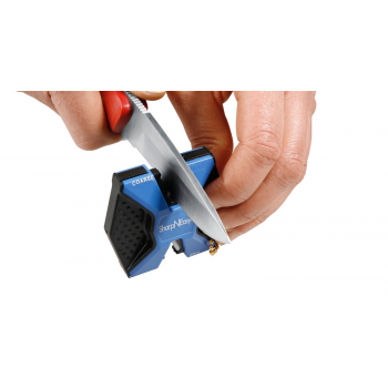 Ascuțitor de cuțit din ceramică SHARP N’EASY. Ascuțitorul ideal pentru cuțite pentru deplasare - mic, ușor și poate fi atașat direct la rucsac datorită ochiului de curea. Cuțitele sunt ascuțite în două etape: blocul din ceramică mai grosieră debavurează lama și o readuce la forma originală. Unitatea de ascuțire fină conferă lamei un tăiș excelent, cu doar câteva mișcări. Armătura de cauciuc asigură aderență și o manevrare sigură.