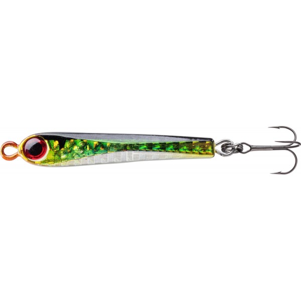 Acest mic mini jig este perfect potrivit pentru pescuitul de biban, păstrăv și avat. Datorită formei corpului, puteți ajunge la distanțele enorme de aruncare - în timpul scufundării, jig-ul se sprijină lateral pe pământ, producând o atracție foarte puternică, sporită și de folia holografică.