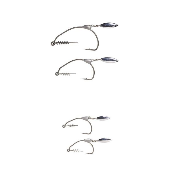 Cârligele unice, extrem de largi, cu șurub , greutate pe burtă și paletă! Perfect pentru utilizarea cu năluci soft. Lestul echilibrează corpul nălucii, iar lama inferioară se rotește și trimite vibrații. Șurubul lung și puternic, va păstra năluca la locul perfect și să reziste mai multor prezentări!