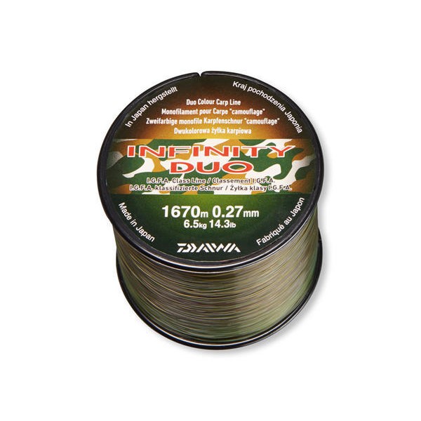 Firul INFINITY aparține liniilor monofilament cele mai cunoscute printre pescarii de crap. Noul INFINITY DUO CAMO este colorat alternativ maro închis și verde închis și, prin urmare, este foarte greu de detectat. Foarte bună putere la nodul umed, în combinație cu o intindere medie, reduce posibilitatea pierderii peștilor în timpul drill-ului și permite pescuitul pe distanțe lungi.