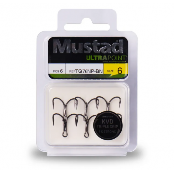 Forma special concepută a ancorei Mustad KVD Elite Series Triple Grip® combină capacitatea excepțională de agățare și înțepare cu o rezistență remarcabilă. Bazat pe seria originală Triple Grip®, designul modificat al lui Kevin VanDam prezintă o formă precisă care aproape „blochează” un pește în curbura brațului, făcând practic imposibilă eliberarea accidentală. Alinierea precisă a vârfuluiasigură un unghi optim de impact, ceea ce duce la o putere crescută la înțepare. Un bonus important este că forma înclinată face ca acest cârlig să fie mai puțin predispus la agățarea obstacolelor submerse decât modelele rotunde. Tija scurtă 2X elimină încurcarea cârligului de nălucă și vă permite să utilizați ancore mai mari. Folosiți-l pe nălucile preferate pentru apă dulce, mai grele, pentru a obține mai multe prezentări.