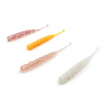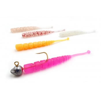 Ușurință în utilizare și flexibilitate - acesta este principiul folosit la realizarea nălucilor soft de dimensiuni mici. Nodurile de pe corpul principal și nervurile triunghiulare de pe coadă sunt comune tuturor modelelor, deci sunt Zain. În plus, designul comun al corpului subliniază doar schimbarea rezistenței diferitelor forme de coadă, iar strategia de pescuit poate fi construită sistematic. Practic, viermii micro de la MUSTAD au fost proiectați să vizeze stavridul de dimensiuni apreciabile, așa că nu există viermi mai mici de 2 inci, cu excepția cozilor care evoluează și care generează unde foarte mari și vibrații puternice. Cu toate acestea, atunci când este necesară o nălucă extrem de mică, se pot îndepărta din noduri astfel încât dimensiunea corpului să poată fi schimbată instantaneu, pentru a obține năluci potrivite momentului. De altfel numărul secțiunilor îmbunătățește flexibilitatea materialului și îmbunătățește rata aspirației. A fost proiectată forma cozii pentru a se potrivi cu diferența de flux a mareei. Dacă luați în considerare viteza mareei pe axa orizontală și diferența de greutate a capului jig pe axa verticală, apare o matrice pentru întâlnirea unui stavrid mare. Cred că a devenit un vierme care a susținut sistematic strategia pescarului și a urmărit ușurința în utilizare. Eficiența acestor năluci, calitatea materialului a determinat extinderea ariei de aplicabilitate pentru aceste năluci. - Materialul din care sunt realizate nu conține Phtalate - Ambalajul include un micro-jig deidcat utilizării cu aceste năluci - Culoare fosforescentă