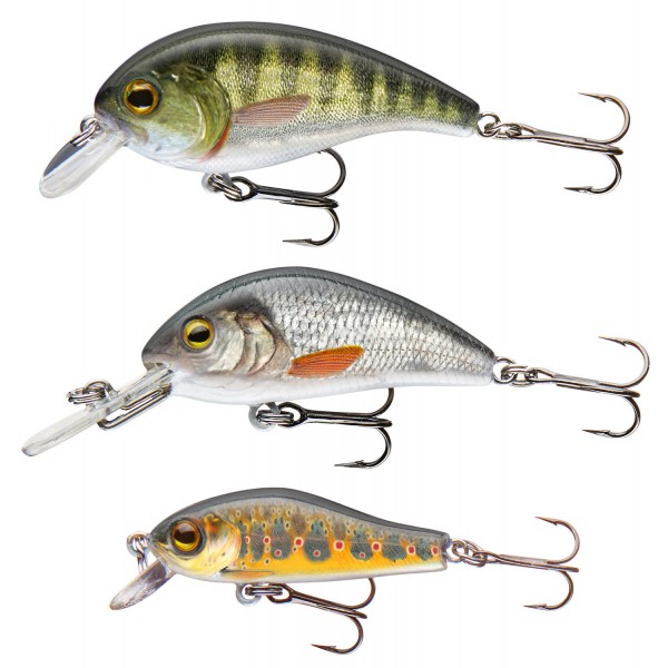 3 voblere diferite, cu 3 modele diferite REALFISH: dyng roach, brown trout și biban.
