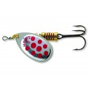 Mărimea rotativei este importantă. Regula generală este să folosiți dimensiunile mai mici pentru a prinde pești mai mici și mai mari pentru a prinde pești mai mari. Țineți cont de rotativele obișnuite care prezintă un profil mai mic decât cele cu skirt sau năluci soft adăugate, astfel încât acestea să pară mai mici față de pești. Pescuitul cu aceste năluci poate atrage pești mai mari. Comet Mepps sunt utilizate cel mai bine în apa curgătoare și unde curentii sunt întrerupți de pietre. Lamele sale funcționează aproape sau departe de axul central. Acțiunea „will o the wisp” este, de asemenea, o carte excelentă în ape stătătoare, unde poate imita un pește rănit în ultimele lui momente. - Unghi de rotație 45 grade - Ideal în curenți slabi sau cu mișcare lentă - Puncte roșii: zile dificile - Punct albastre: pești activi - Forma prezentare - blister