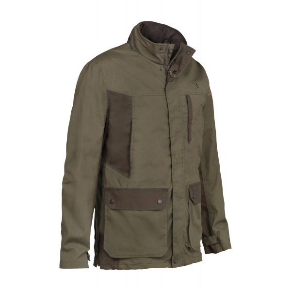 Jachetă de vânătoare complet impermeabilă. Material 65% PE, 35% CO, dublura plasă 100% poliester. Buzunare mari cu clapete și aplicație cartușieră. Glugă detașabilă integrată în guler, deschideri de ventilație sub axilă și buzunar mare la spate pentru vânat.